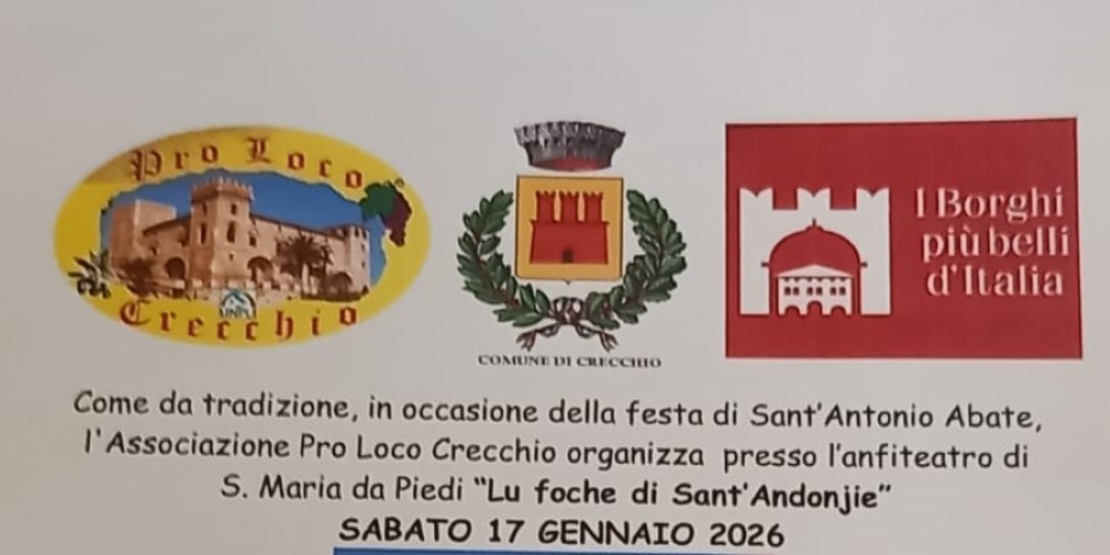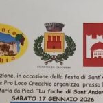 In occasione della festa di Sant’Antonio Abate, la Pro Loco di Crecchio APS, con il patrocinio del Comune di Crecchio, organizza “Lu Foche di Sant’Andonjie”, uno degli eventi tradizionali più sentiti del territorio. La manifestazione si terrà presso l’anfiteatro di Santa Maria da Piedi, dove verrà acceso il grande fuoco rituale, simbolo di purificazione e […]